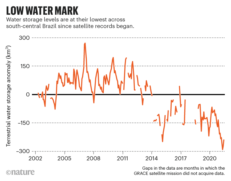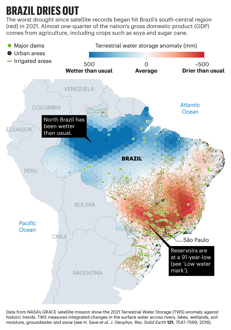 Este ano, entre março e maio, o tempo seco na região centro-sul do Brasil levou a uma escassez de 267 km cúbicos de água retida em rios, lagos, solo e aquíferos, em comparação com a média sazonal dos últimos 20 anos .