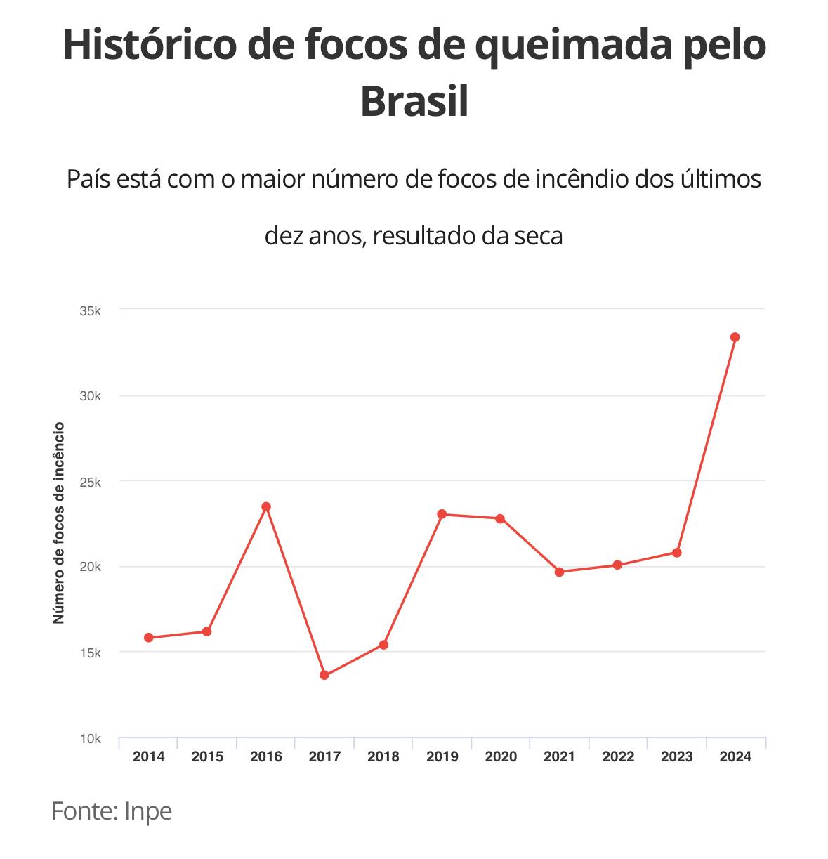 Segundo o monitoramento feito pelo Instituto Nacional de Pesquisas Espaciais (Inpe), este ano é o maior em registros de focos de incêndio no país nos últimos 10 anos (veja abaixo).