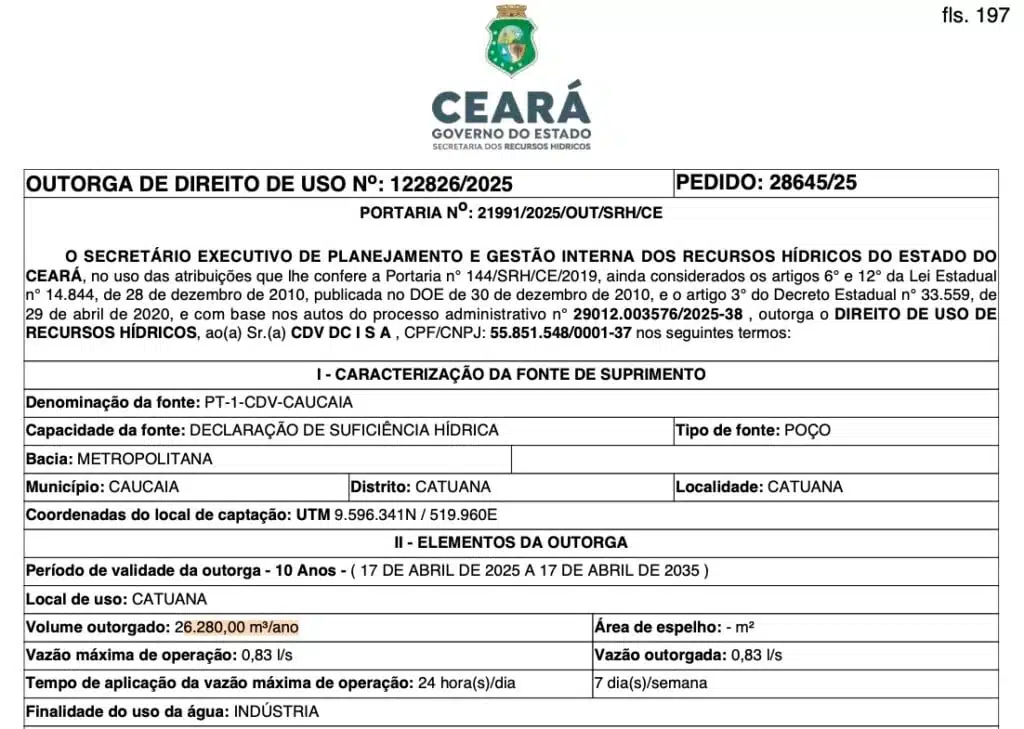 “Declarar consumo de 19 mil litros e receber autorização para captar 144 mil sem justificativa revela uma política que negligencia comunidades e a gestão responsável de recursos naturais. Autorizar a exploração dos aquíferos do Cauípe, em uma região já marcada por conflitos pela água, é uma decisão que viola direitos e agrava a insegurança hídrica local”, disse Picolo.