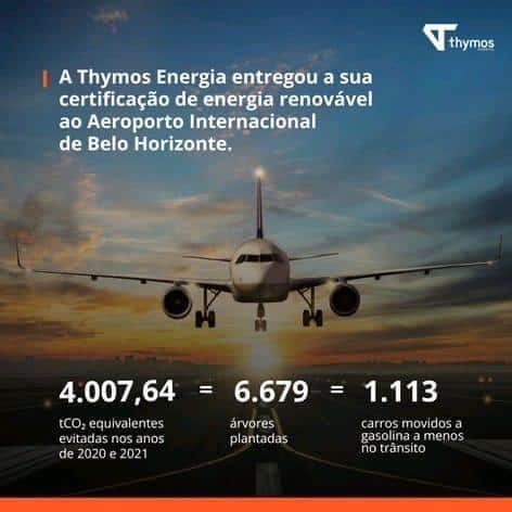 A Thymos Energia, uma das maiores empresas brasileiras de consultoria e gestão de energia, entregou ao Aeroporto Internacional de Belo Horizonte, em Minas Gerais, sua certificação de energia renovável, que quantifica e qualifica os benefícios ambientais da estratégia de contratação de energia no mercado livre por meio de fontes renováveis. A medida adotada pelo Aeroporto contribuiu para evitar a emissão de 4.007,64 tCO2 equivalente, um dos gases causadores do efeito estufa, entre 2020 e 2021, o que representa o plantio de 6.679 árvores, ou a compensação anual das emissões de 1.113 carros movidos a gasolina, de acordo com dados do Instituto de Pesquisa Econômica Aplicada (IPEA).