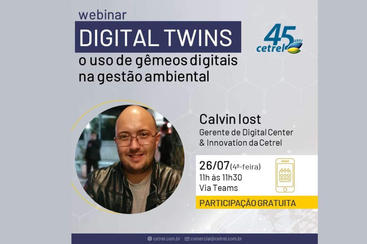 A Cetrel promove no dia 26 de julho, a partir das 11h, um webinar com o tema “O uso de gêmeos digitais na gestão ambiental”. Totalmente gratuito, o evento terá como palestrante o gerente do setor de digital center da companhia, Calvin Iost. Os interessados devem realizar a inscrição pelo link: https://forms.office.com/r/6Yhs3RrYpV