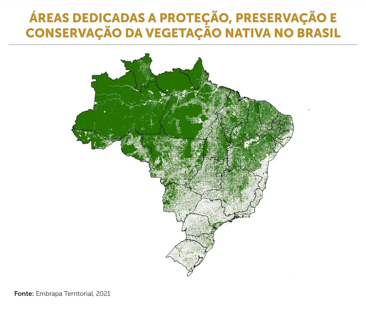 O gráfico a seguir, o green card do Brasil, destaca a dimensão das áreas dedicadas à preservação e à proteção da vegetação nativa (66,3% do país) e o papel decisivo dos agricultores na preservação ambiental (33,2% do país). O mundo rural “ocupa” cerca de 63,4% do território nacional, usa apenas 30,2% (pastagens, lavouras e florestas plantadas) e destina à preservação da vegetação nativa uma área equivalente a um terço do território nacional.