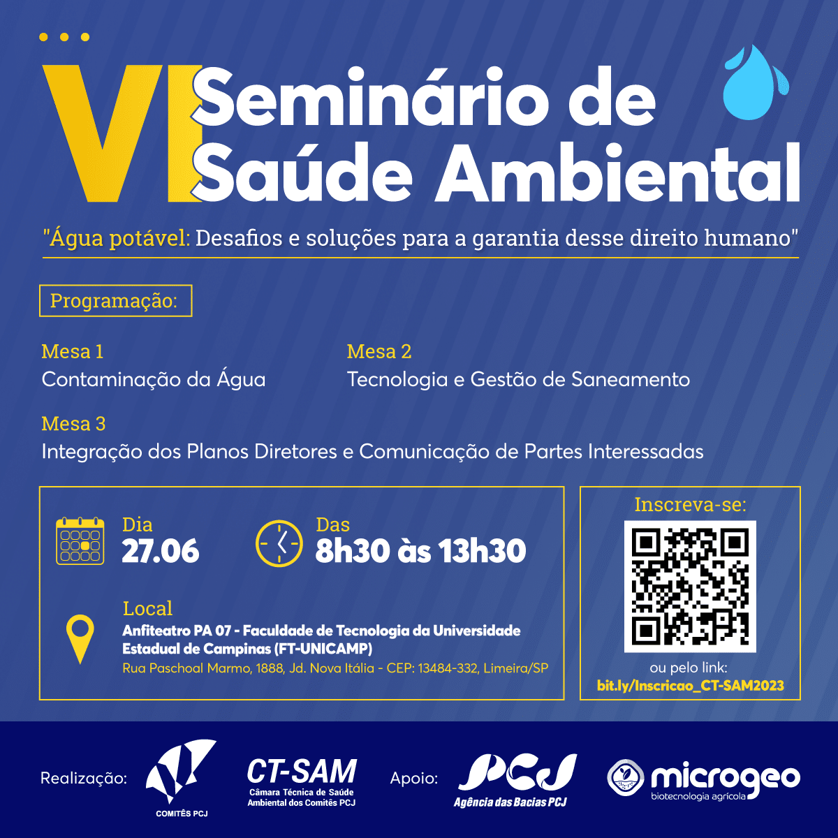 No dia 27 de junho, a Câmara Técnica de Saúde Ambiental (CT-SAM) dos Comitês PCJ realizará o VI Seminário de Saúde Ambiental, na Faculdade de Tecnologia da Universidade Estadual de Campinas (FT-Unicamp), em Limeira (SP). O evento terá como tema “Água potável: Desafios e soluções para a garantia desse direito humano” e ocorrerá das 8h30 às 13h30.