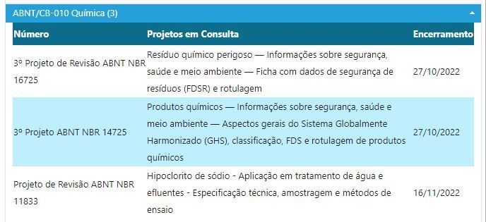 A ABNT disponibilizou para consulta nacional até o dia 27/10/2022, as normas elaboradas pelo comitê ABNT/CB-10 (Química), sobre informações de segurança, saúde e meio ambiente, referentes à produtos químicos e resíduos químicos perigosos:
