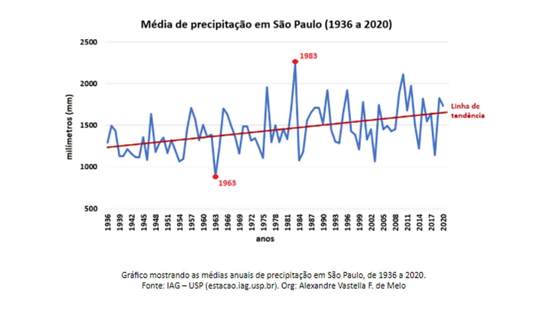 Estes dados existem desde 1936 e deveriam subsidiar a gestão hídrica, para não sermos pegos de surpresa quando chove menos ou chove demais. Este ano de 2021, por exemplo, ao contrário do que se diz, até agora está chovendo acima da média (989 mm para uma média de 923 no período medido). E observem no gráfico que a linha de tendência é ascendente, ou seja, o volume total de chuvas tende a aumentar na RMSP, e não a diminuir.