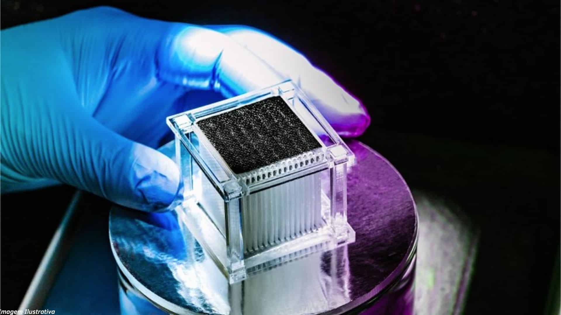 Uma membrana alinhada horizontalmente e revestida com nanotubos de carbono atua como uma camada de absorção de luz na superfície superior do cubo – trata-se de uma absorção fototermal, e não fotovoltaica. Abaixo dela, uma série de membranas orientadas verticalmente, ou “pontes de transferência de massa”, separam o absorvedor solar da água salgada que entra no sistema.