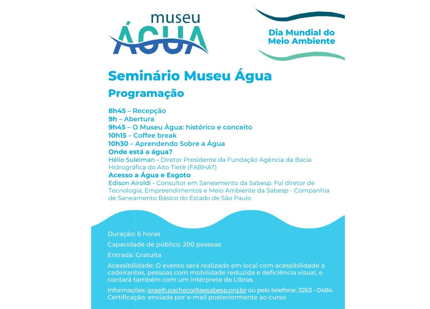 A Associação dos Engenheiros da Sabesp – AESabesp, o Instituto Pedra e a Base 7 Projetos Culturais promoverão, na próxima segunda-feira, 5 de junho, Dia Mundial do Meio Ambiente, o Seminário Museu Água, gratuito e voltado a educadores. Este será o primeiro encontro oficial dedicado a apresentar o projeto cultural de criação do museu aos profissionais da educação, que conhecerão mais sobre a importância da água e do saneamento e farão uma imersão neste universo fundamental à qualidade de vida das pessoas e do planeta (as inscrições podem ser feitas neste link https://forms.gle/EQzQXDUd1QrgRC397) .