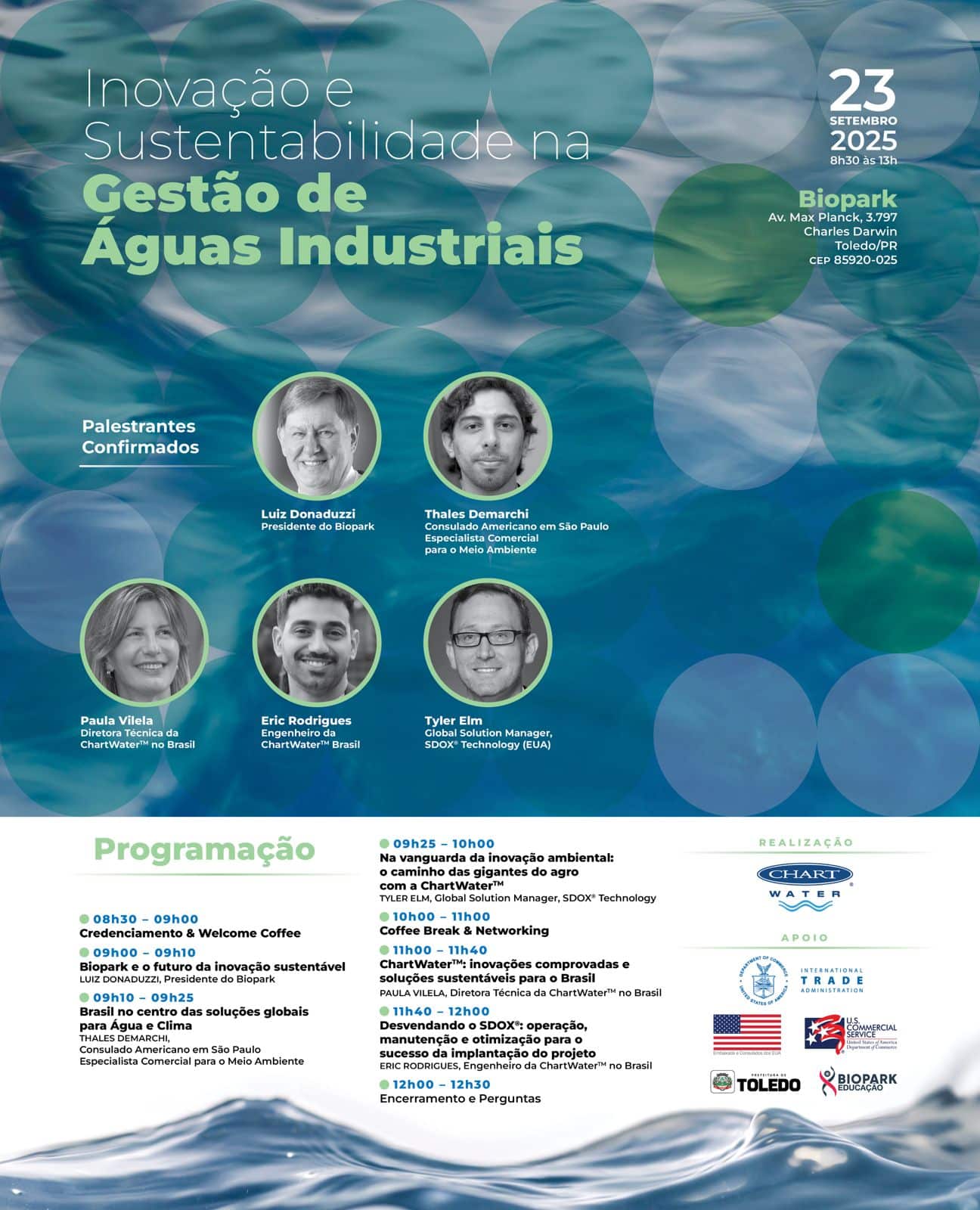 A ChartWater™, referência global no tratamento de águas e efluentes industriais, convida para o evento Inovação e Sustentabilidade na Gestão de Águas Industriais, que será realizado no Biopark, em Toledo/PR, no dia 23 de setembro de 2025, das 08h30 às 13h00.