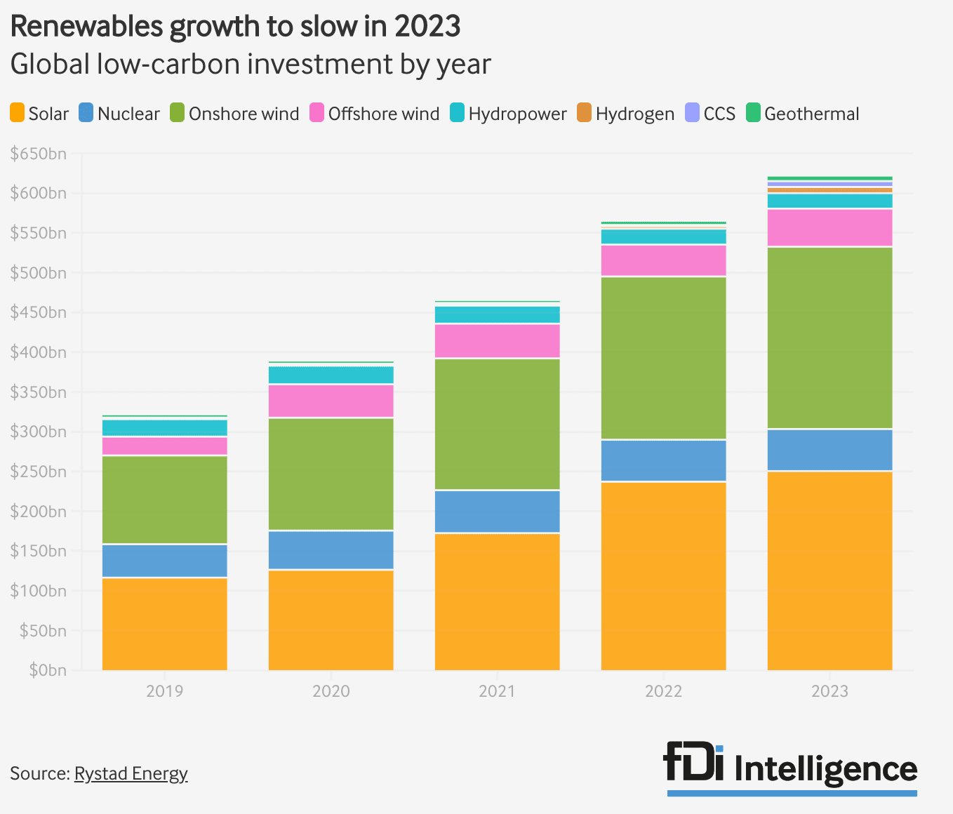 A consultoria Rystad Energy prevê que o investimento em indústrias de baixo carbono, que inclui energia nuclear ao lado de renováveis tradicionais, atinja US$ 623 bilhões em 2023 – quase US$ 60 bilhões em relação aos US$ 566 bilhões do ano passado.