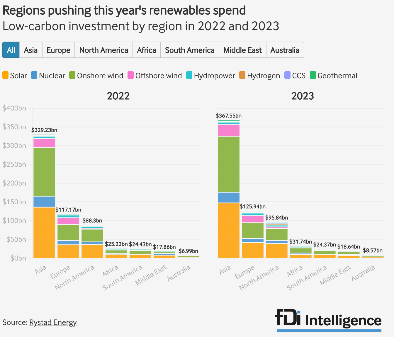 Ao lado dos EUA, a China será um dos principais impulsionadores do aumento dos gastos este ano, pois persegue sua meta de instalar 1.200 gigawatts de capacidade eólica e solar até 2030. Martinsen também espera que Egito , Vietnã, Indonésia, Arábia Saudita, Espanha e Filipinas para postar grandes aumentos de gastos.