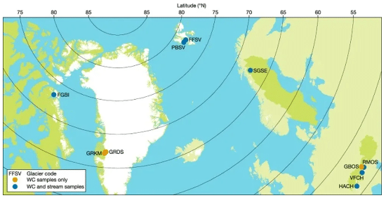Os cientistas coletaram gelo do derretimento de oito geleiras na América do Norte e na Europa e duas da calota de gelo da Groenlândia. Eles estudaram as amostras para aprender mais sobre a microbiota no escoamento. De modo alarmante, havia dezenas de milhares de micróbios em apenas milímetros de água coletada.