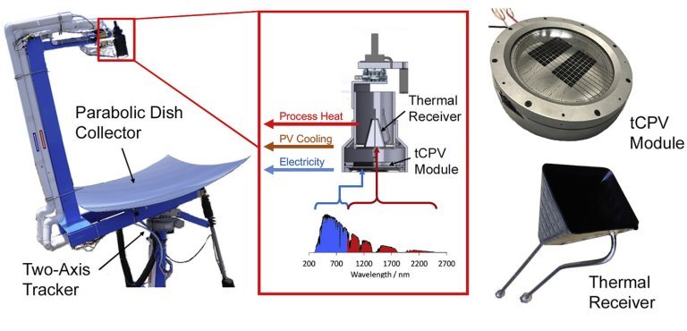 Ele gera eletricidade a partir de células solares de múltiplas junções de alta eficiência que também redirecionam os raios infravermelhos da luz solar para um receptor térmico, que converte esses raios em energia térmica.