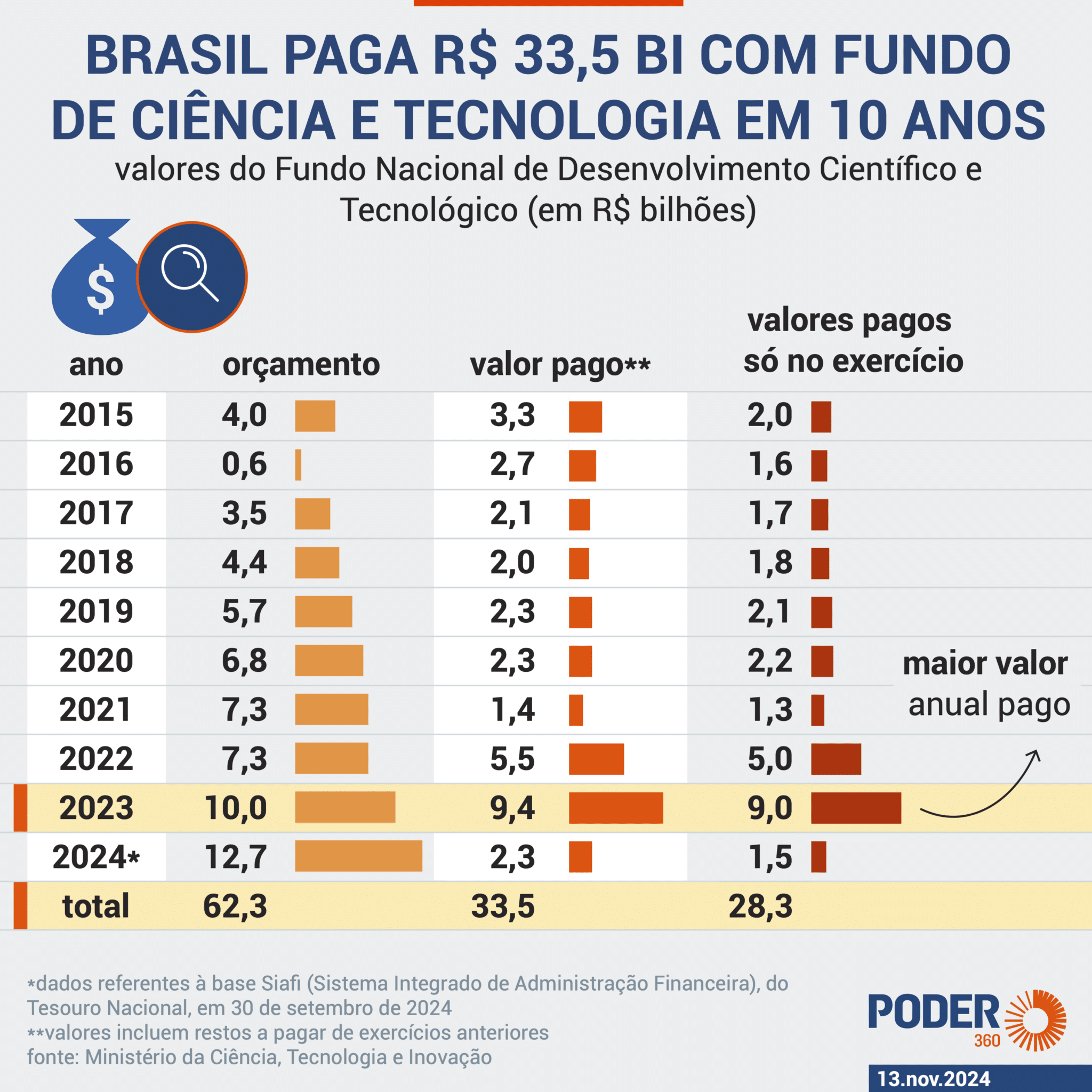 O governo destinou R$ 62,3 bilhões ao FNDCT (Fundo Nacional de Desenvolvimento Científico e Tecnológico) de 2015 a 2024. A quantia diz respeito à dotação orçamentária para o dispositivo em 10 anos.