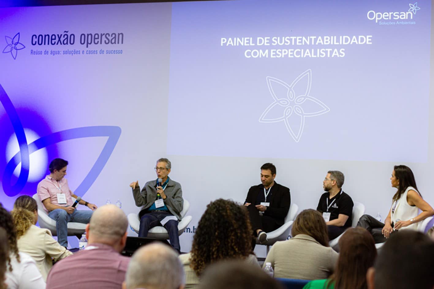 Painel com representantes e parceiros: participação de Luiz Panutti (Companhia de Saneamento de Jundiaí), Virgínia Sodré (Infinity Tech), Luiz Bezerra (Aladyr) e Fernando Rocha (Croda), com mediação de Diogo Taranto, diretor de Novos Negócios da Opersan.