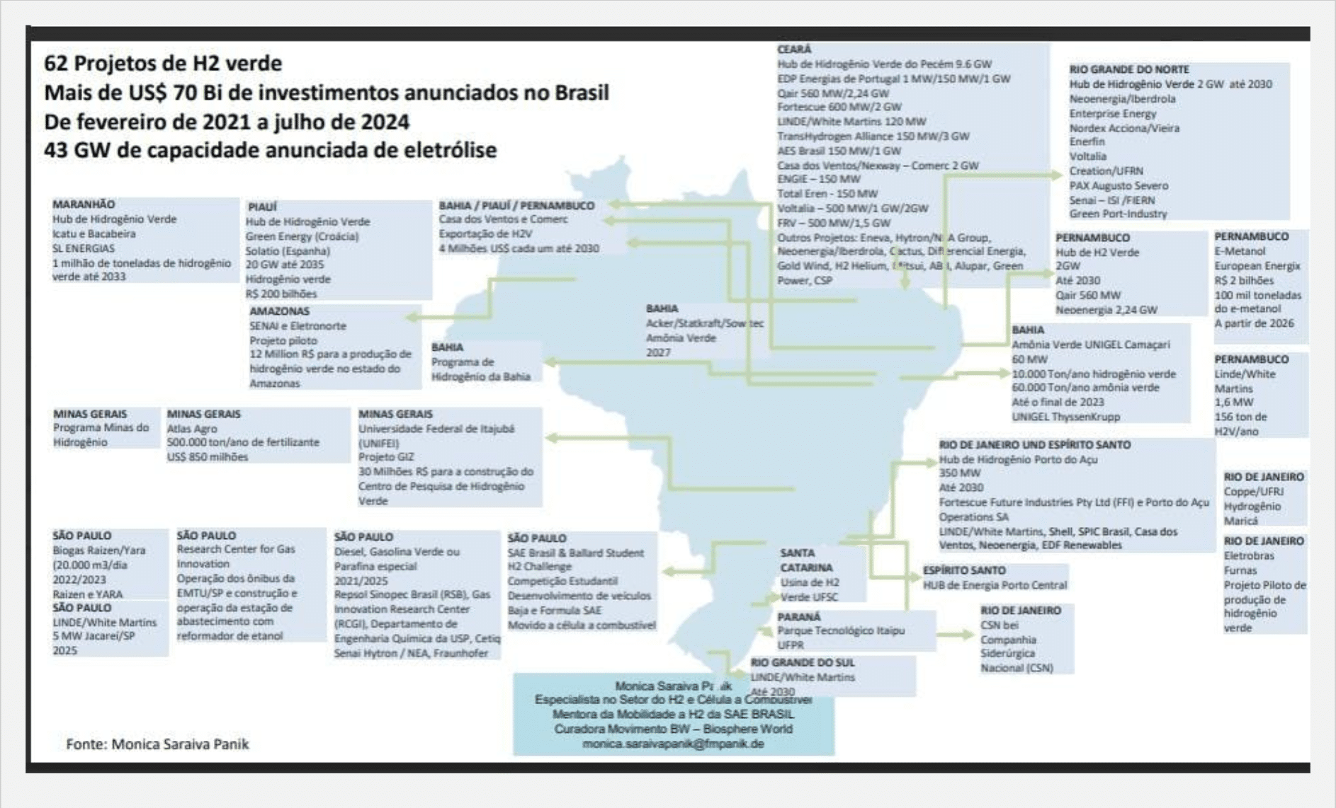 Os dados foram elaborados e apresentados por Mônica Saraiva Panik, coordenadora do sub-grupo da indústria do MiBI, Made in Brazil Integrado, H2 GE8 e mentora de mobilidade a hidrogênio da SAE Brasil. O webinar Integração da Indústria Brasileira na Nova Economia de Hidrogênio, realizado de forma online pelo Sindipeças no dia 17 de Julho.