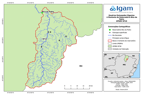 Cabe esclarecer que o Reservatório Bico da Pedra foi construído pelo Departamento Nacional de Obras Contra as Secas (DNOCS), com recursos federais, sendo as outorgas para uso de água do reservatório de competência da União e reguladas pela Agência Nacional de Águas (ANA). Estas outorgas não estão incluídas na presente portaria de escassez hídrica por já seguirem as regras de uso especificadas na Resolução Conjunta ANA/IGAM nº 1.564, de 21 de agosto de 2017.