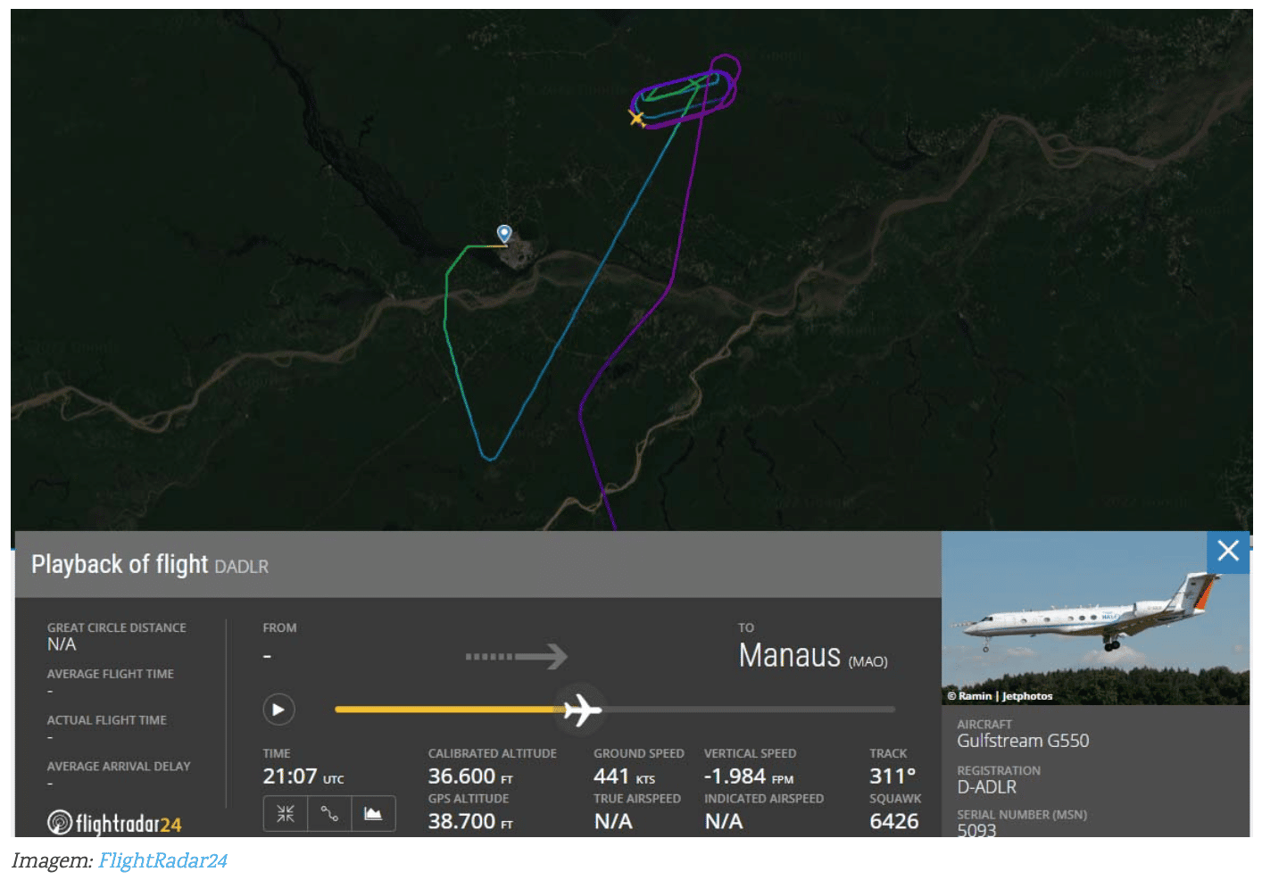 Um avião executivo do modelo Gulfstream G550, de matrícula alemã D-ADLR, tem sido visto na região de Manaus desde o começo deste dezembro. Numa rotina que se repete ao longo dos dias, ele decola, faz voos com vários círculos (órbitas) sobre a Amazônia e volta.