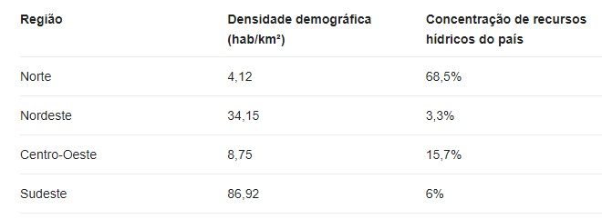No entanto, um país com a aparente abundância de recursos hídricos sofre com crises hídricas, principalmente nas regiões que apresentam maior densidade demográfica, pois onde há maior concentração de recursos hídricos, não é necessariamente onde há a concentração demográfica, como podermos observar no quadro abaixo, com destaque para a região Sudeste: