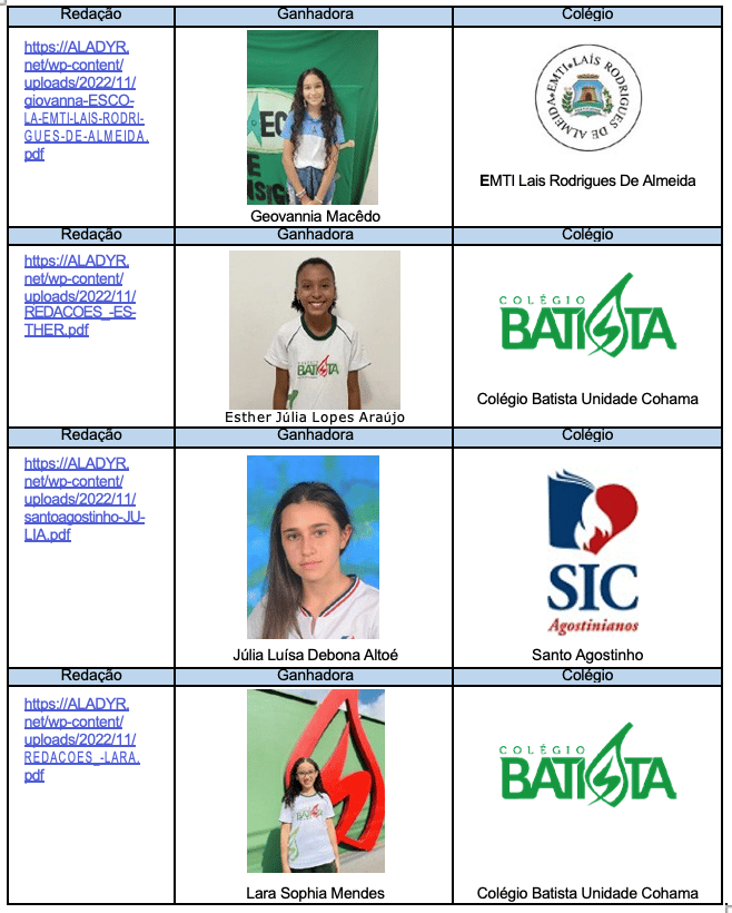 As crianças ganhadoras da redação são apresentadas a seguir: