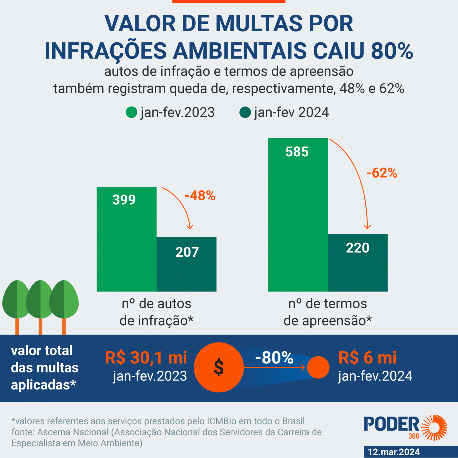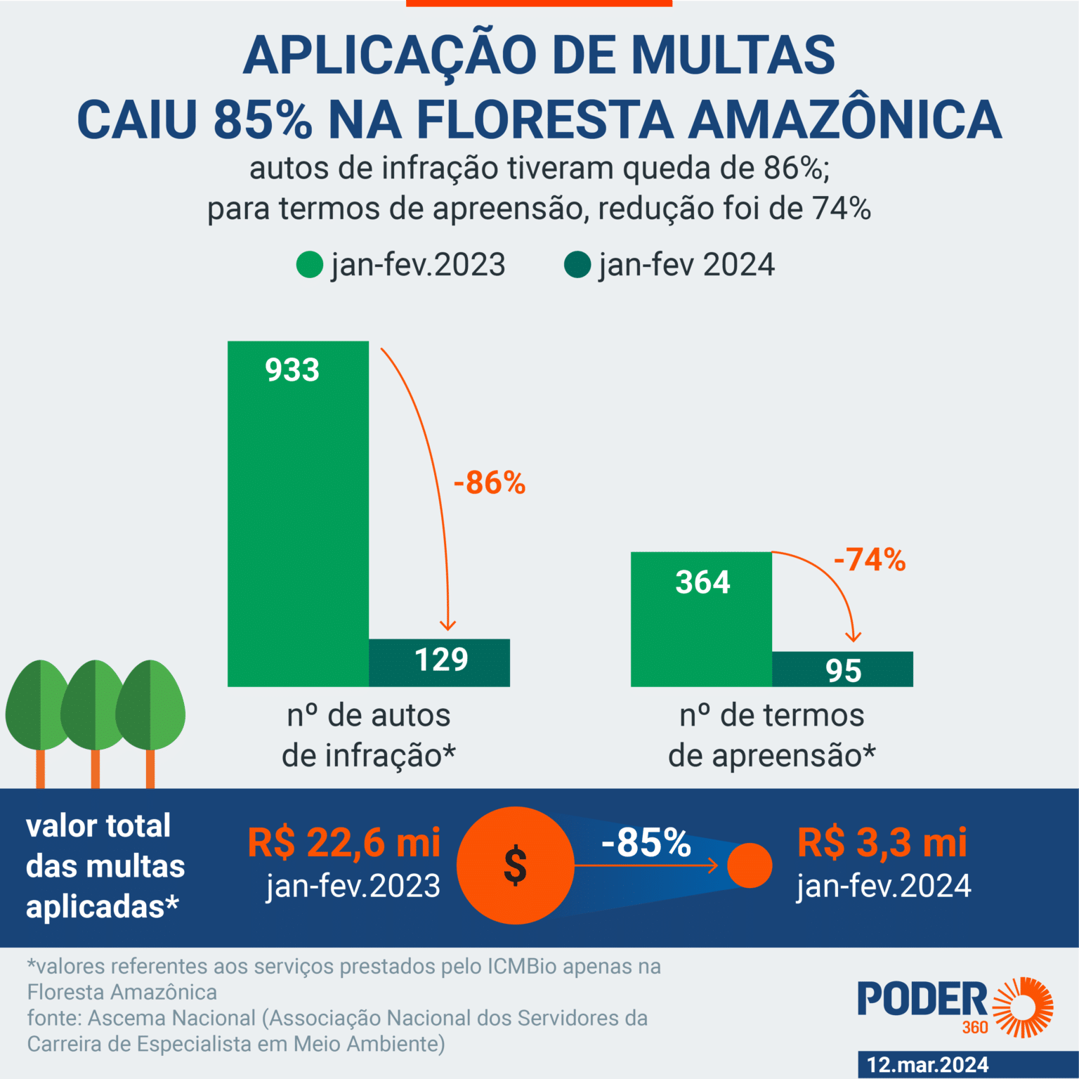 Segundo o levantamento da Ascema Nacional, desde que a paralisação teve início em 2024, o número de autos de infração emitidos pelo ICMBio teve queda de 48%. A quantidade de termos de apreensão, por sua vez, caíram 62%. O valor aplicado em multas ambientais reduziu em 80%. As comparações consideram os 2 primeiros meses de 2023 e 2024.