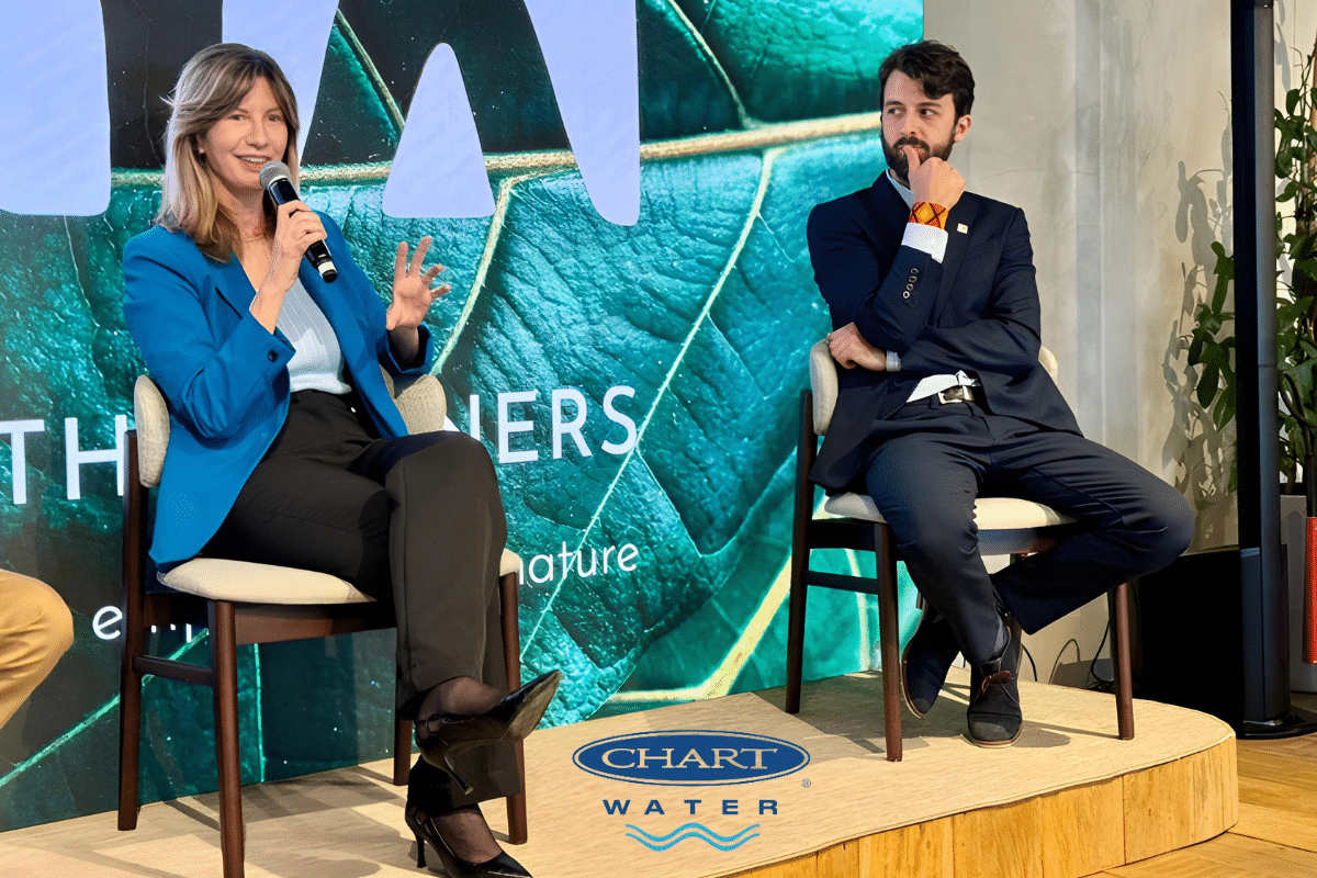 Paula Vilela, diretora da ChartWater™, participou das discussões sobre as soluções baseadas na natureza e carbono azul, compartilhando as soluções tecnicamente comprovadas do sistema SDOX que foram implantadas nos projetos de recuperação ambiental do Novo Rio Pinheiros, liderado pela Sabesp, e no Rio Joana, pela concessionária Águas do Rio.