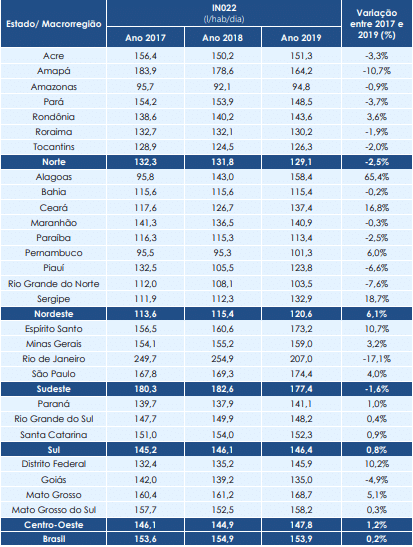 De acordo com SNIS – Sistema Nacional de Informações sobre Saneamento do Ministério das Cidades, no último levantamento realizado em 2019, cada brasileiro consome, em média 153,9 litros de água por dia (em 2018 eram 154,9 L/dia).