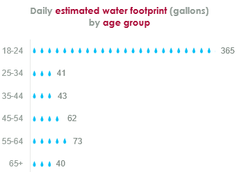 - A estimativa média cai drasticamente para os Millennials, com idades entre 25-40, em 36 galões (136 L) e permanece baixa ao longo das gerações mais velhas também.