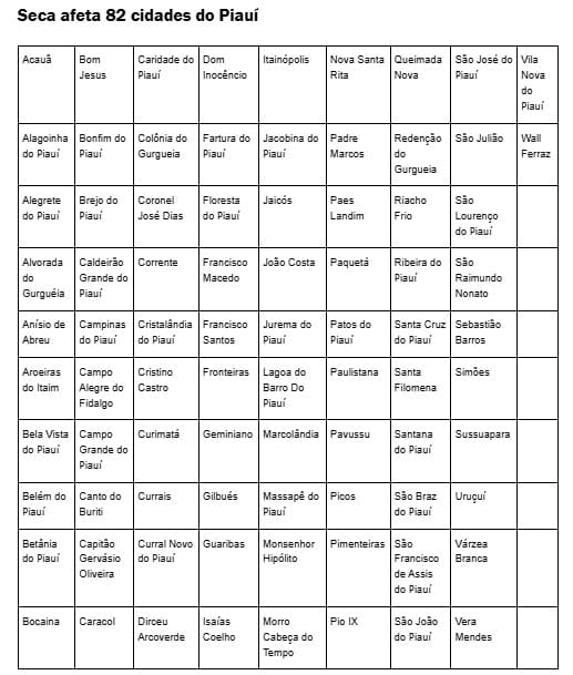A decisão levou em conta a falta de chuvas no território piauiense, que já dura seis meses, além da previsão de poucas chuvas na região sudeste do Piauí entre janeiro e fevereiro de 2025.