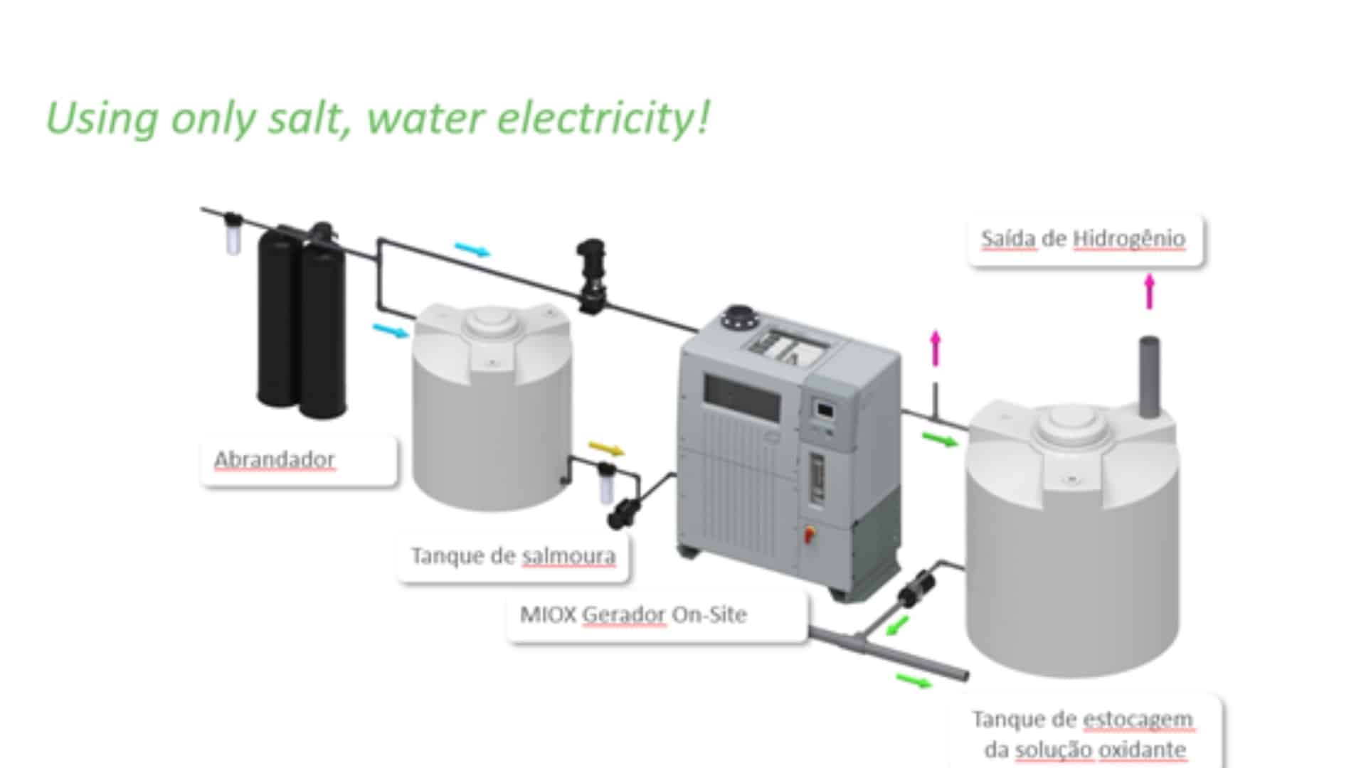 O MIOX produz uma solução mista de hipoclorito de sódio e peróxido de hidrogênio, em concentrações de 0,4% (4.000 ppm) e 0,02% (200 ppm) respectivamente.