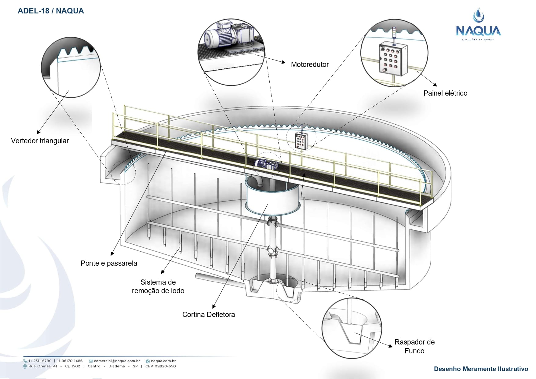 O ADENSADOR DE LODO modelo ADEL, produzido pela NAQUA, promove a remoção do lodo decantado e a separação do líquido clarificado. O lodo removido pelo adensador, em média, tem um teor de sólidos entre 2 e 8%. O clarificado separado retorna ao início do tratamento.