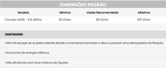 Tem por objetivo a introdução de oxigênio no meio líquido para redução de carga orgânica presente no efluente. Sua instalação é feita no fundo dos tanques de aeração podendo ser por tubos de alimentação fixos ou flutuantes e recomendáveis para profundidades superiores a 03 (três) metros.