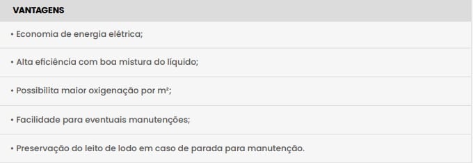 Tem por objetivo a introdução de oxigênio no meio líquido para redução de carga orgânica presente no efluente. Sua instalação é feita no fundo dos tanques de aeração podendo ser por tubos de alimentação fixos ou flutuantes e recomendáveis para profundidades superiores a 03 (três) metros. O sistema de tubos de alimentação flutuantes possibilita eventual implantação e manutenção sem o esvaziamento do tanque ou lagoa.