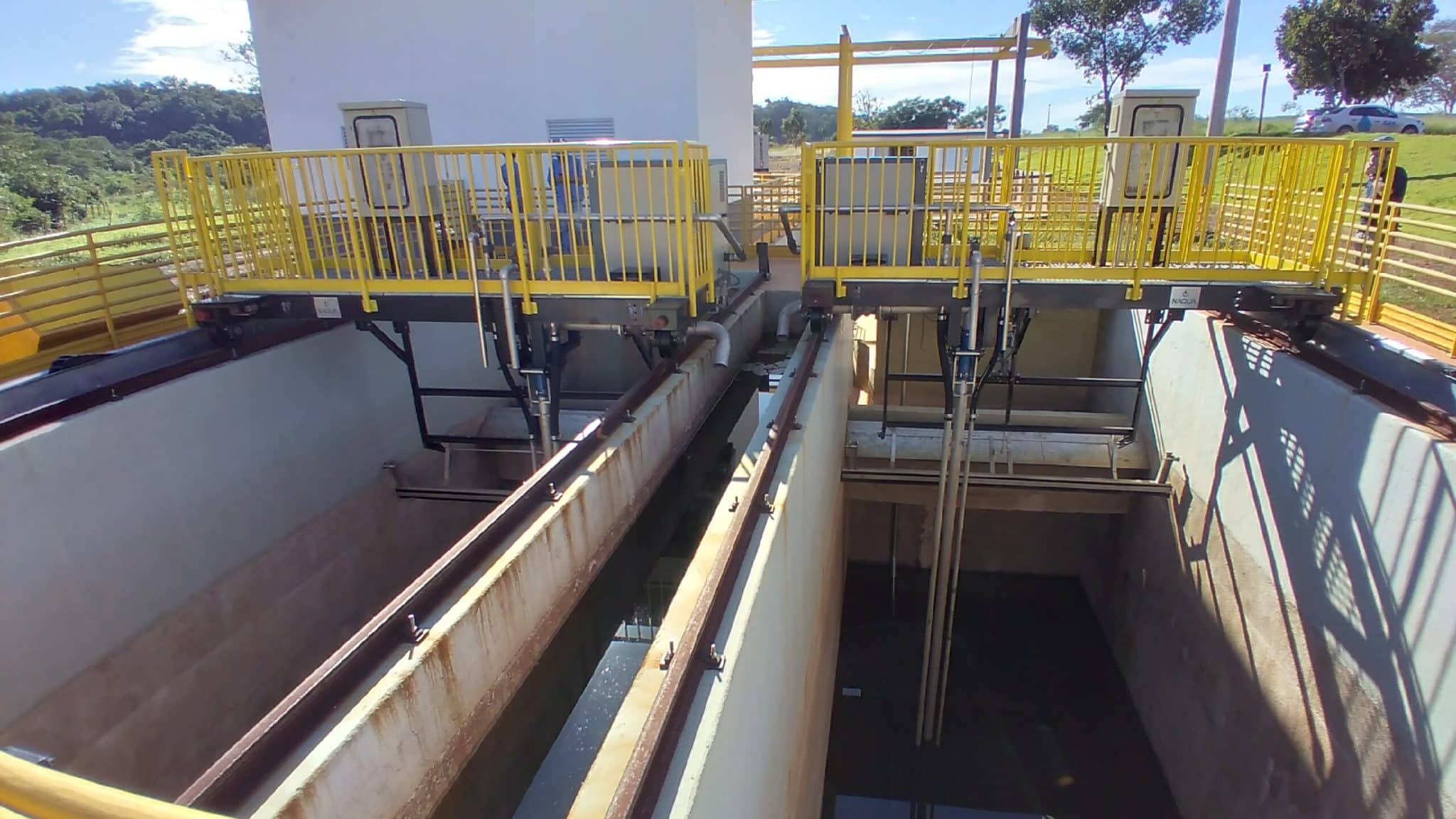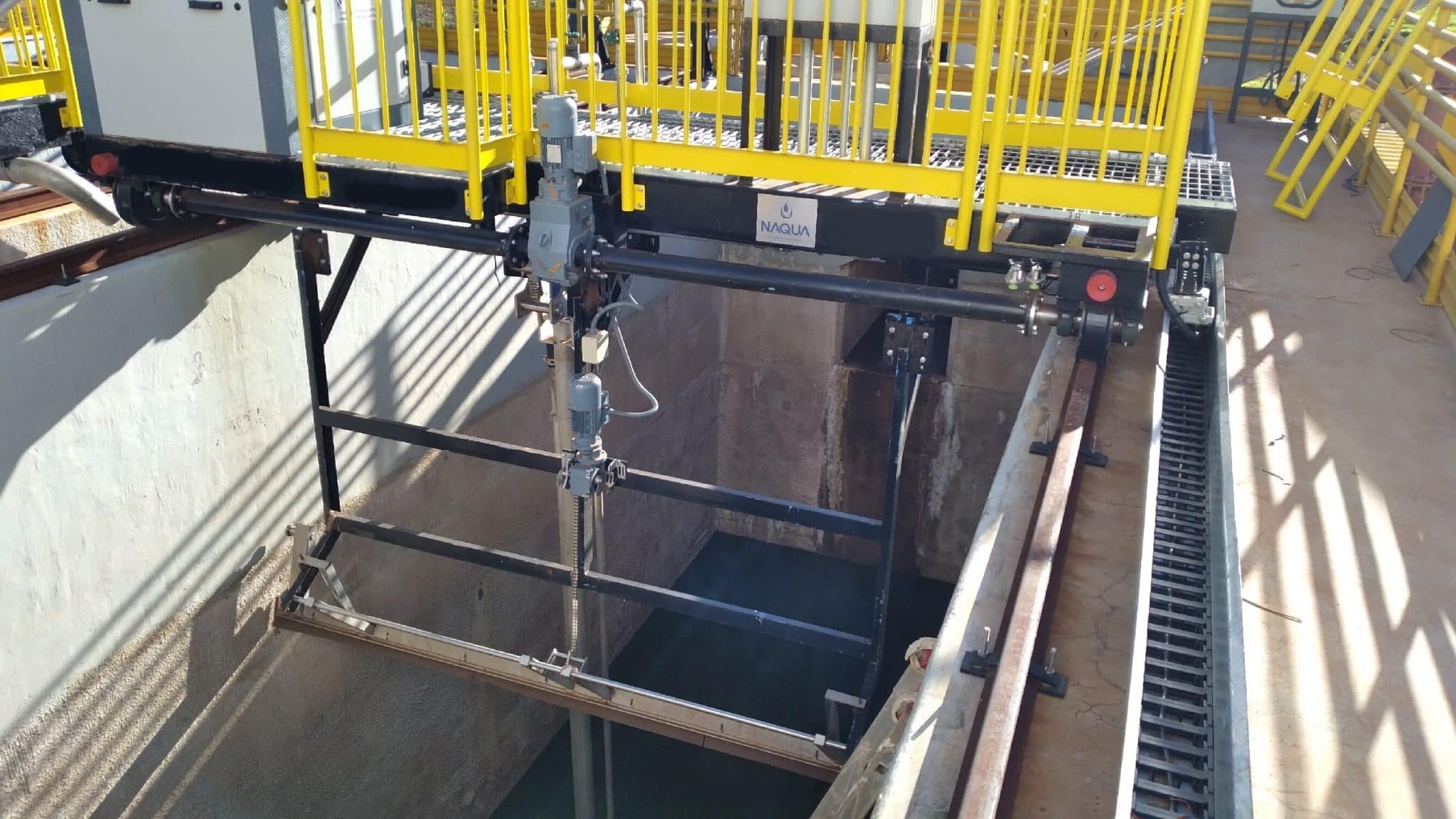 – DESARENADOR COM REMOÇÃO DE AREIA POR BOMBA modelo DSPR-BB. Equipamento móvel por ponte rolante sobre trilhos, montado em tanque retangular, com retirada do material decantado por processo de bombeamento e descarga em canaleta lateral com tremonha e classificador. Esta máquina tem exclusivo sistema de proteção contra descarrilamento da ponte desenvolvido pela NAQUA;