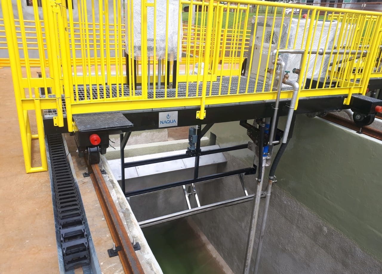 – DESARENADOR COM REMOÇÃO DE AREIA POR AIR LIFT modelo DSPR-AL. Equipamento móvel por ponte rolante sobre trilhos, montado em tanque retangular, com retirada do material decantado por processo air lift e descarga em canaleta lateral com tremonha e classificador. Esta máquina tem exclusivo sistema de proteção contra descarrilamento da ponte desenvolvido pela NAQUA;