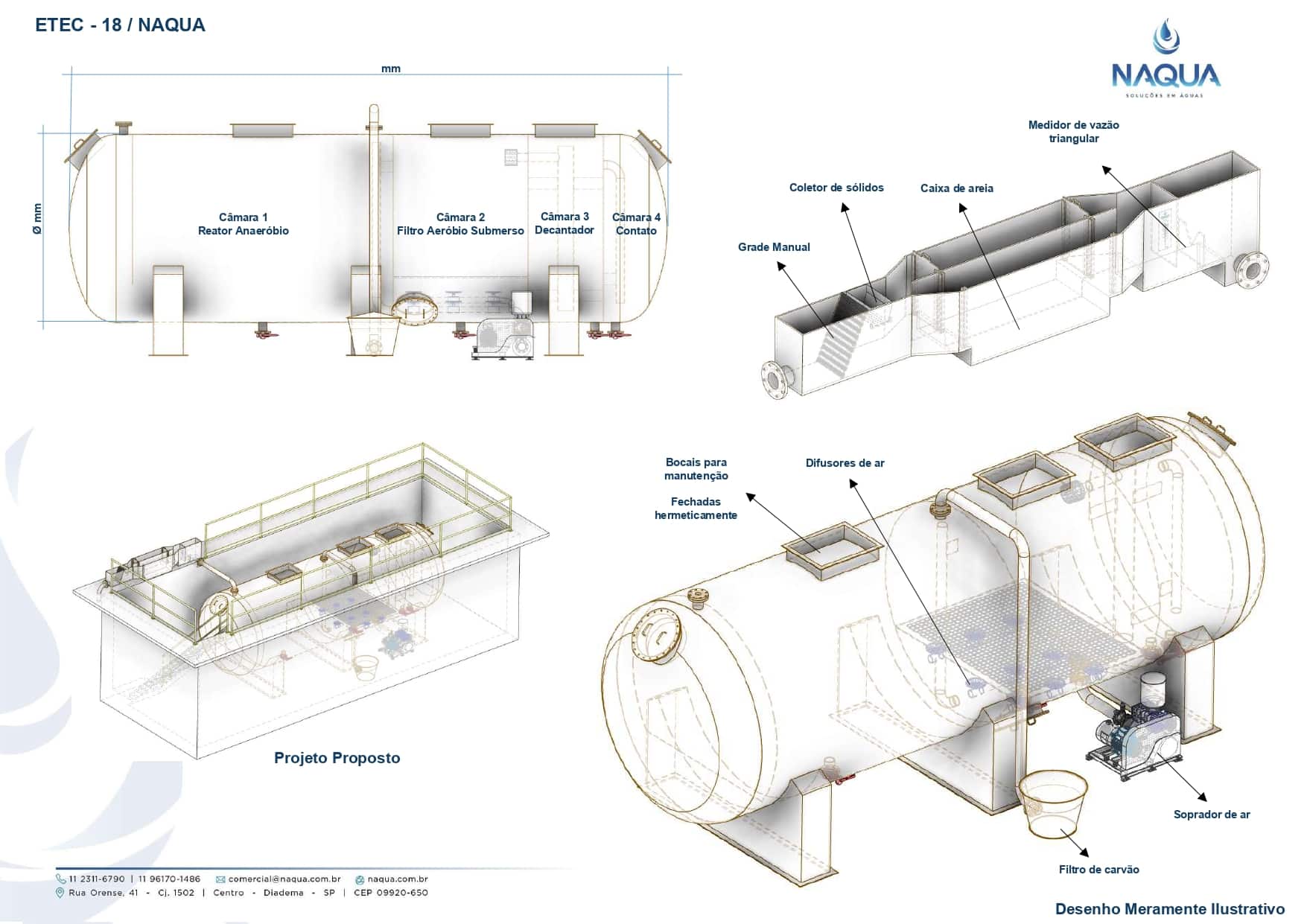 – ETE COMPACTA modelo ETEC, composta por módulo preliminar com gradeamento, remoção de areia, óleo e medição de vazão, elevatória, reator anaeróbio de fluxo ascendente (RAFA), filtro aeróbio submerso (FAS), decantador secundário e desinfecção final.