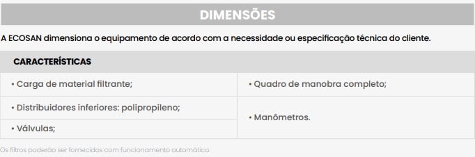 A ECOSAN projeta e dimensiona filtros especiais para remoção de: FERRO, MANGANÊS, NITROGÊNIO AMONIACAL, CHUMBO, CROMO, NÍQUEL, ZINCO, PRATA, COBRE E ESTANHO. Para tanto, os filtros serão preenchidos com elementos filtrantes modificados de acordo com a análise da água a ser tratada