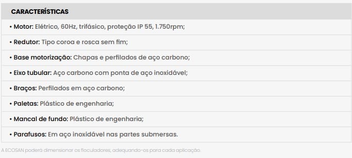 São constituídos por uma unidade motriz e um eixo principal tubular, no qual são fixados 4 braços, cada um suportando de 2 a 4 paletas verticais, em função do tamanho do floculador. Possui um mancal-guia do eixo principal instalado no fundo do tanque.