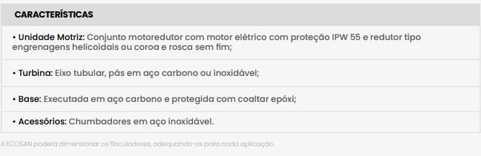 Utilizado em estações de tratamento de água para promover uma agitação lenta e uniforme de toda massa líquida a ser tratada que, após ser misturada com reagentes, permite a formação de flocos de impurezas, sem que ocorra a quebra dos mesmos.
