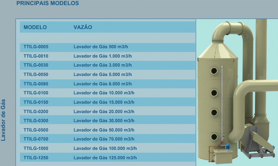 O Lavador de Gases da Tecitec é fabricado em polipropileno, e dotado de uma bomba química para circulação do líquido lavador, que é pulverizado na câmara de névoa, através de um banco de bicos ejetores “spray” fabricados em aço inoxidável 304, uma câmara de retenção de gotas, localizada acima da câmara de névoa, e um setor de contato gás/líquido, abaixo da câmara de névoa, constituído por um compartimento recheado com anéis tipo “Pall” em polipropileno.