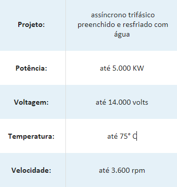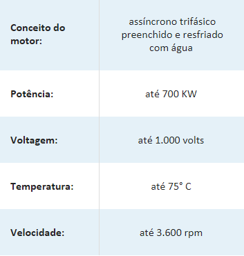 Por exemplo, eles são projetados com rotores tipo gaiola de esquilo, trifásicos, assíncronos, resfriados a água e com vedação do eixo através de selo mecânico.
