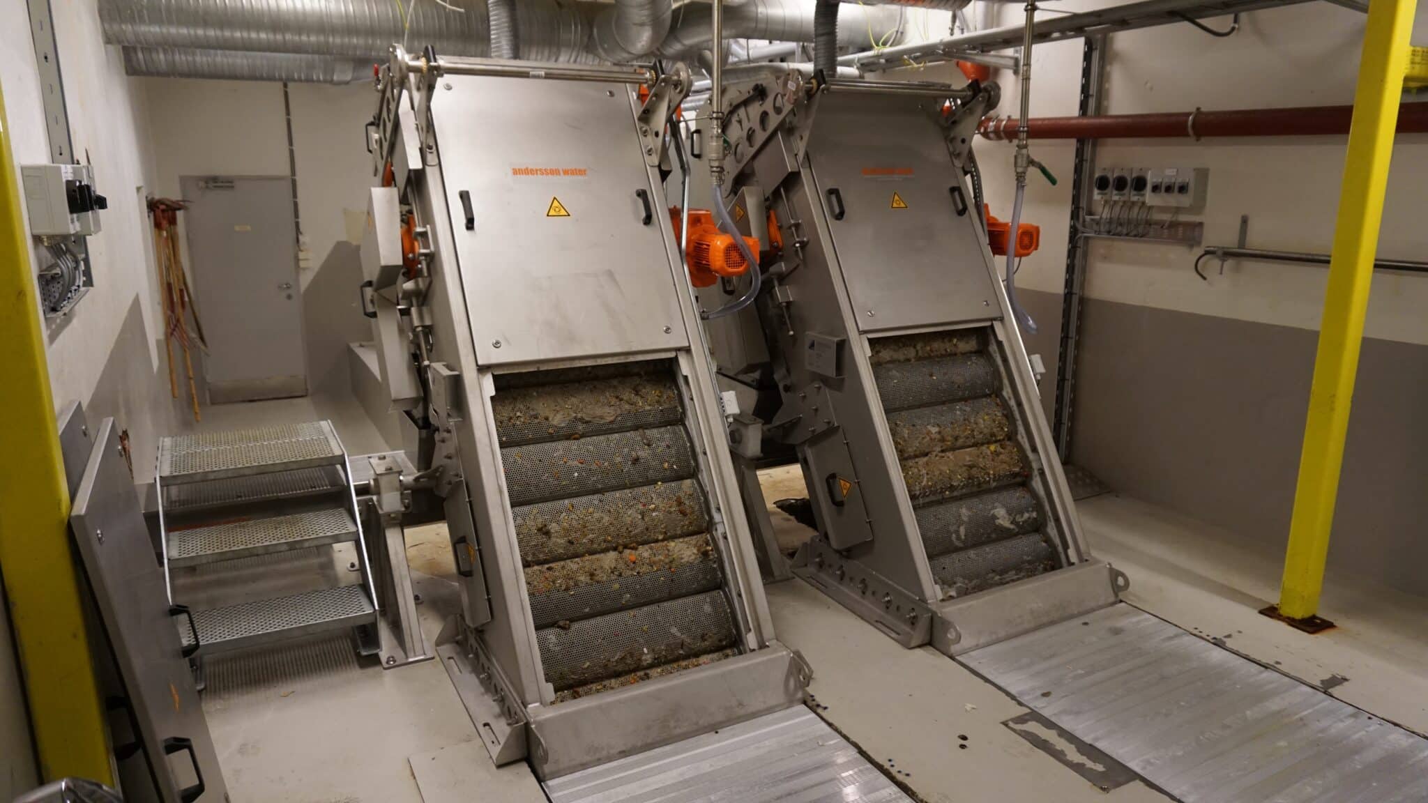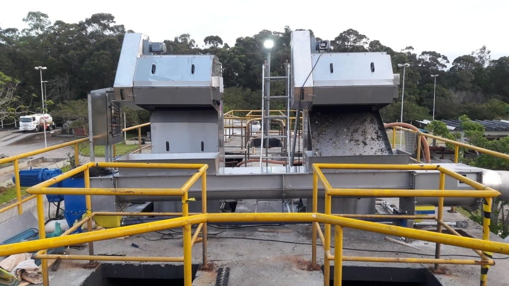 A peneira autoportante de parafuso modelo SS separa os sólidos (gradeados, lixo) da água, lava-os e desidrata-os. Uma espiral rotativa com uma escova periférica faz a limpeza do cesto filtrante.
