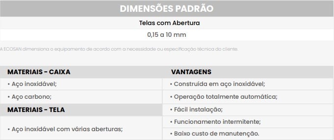 Utilizadas para retenção e separação de sólidos em suspensão dos efluentes brutos, usualmente é utilizada como unidade preliminar nas plantas de tratamento de efluentes, ou mesmo nas captações de tratamento de água. É de construção robusta, projetada para longa vida útil e baixa manutenção.