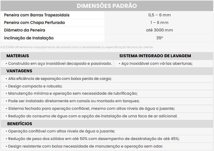 É um peneiramento fino composto por um semicesto circular com perfis paralelos ou chapa perfurada com aberturas conforme projeto Instalada inclinada no canal, possui dispositivo de lavagem do material peneirado e sistema de compactação dos sólidos no fuso antes da descarga.