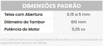 A peneira rotativa é do tipo autolimpante e formada por um tambor filtrante rotativo, montado horizontalmente sobre a estrutura de sustentação através de flanges de centralização e mancais de apoio. O acionamento é formado por um conjunto motoredutor, de forma a manter uma velocidade adequada do tambor para uma eficiente remoção dos sólidos.
