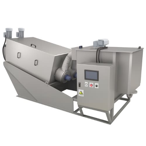 O espaço e o passo da rosca se estreitam progressivamente, aumentando a pressão interna e compactando o lodo até formar a torta desidratada.