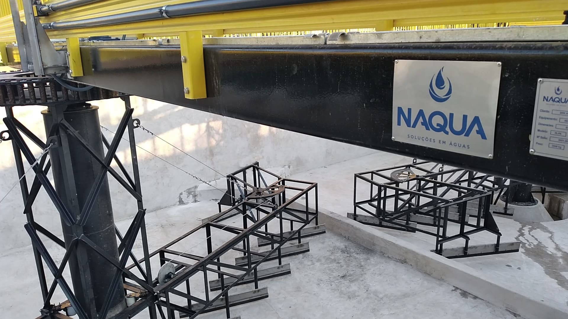 – REMOVEDOR DE LODO SUBMERSO POR SUCÇÃO TIPO MANGUEIRA modelo RLSM. Remoção por sucção, montado no fundo de tanque retangular, com braços succionadores tubulares móveis e mangueira de descarga, movimentação por cabos de aço, polias, motoredutor e tambor de enrolamento.