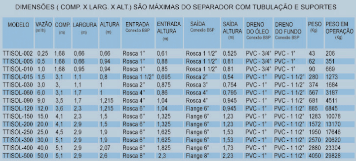 Os separadores de água e óleo trabalham em regime contínuo com drenagem constante do óleo separado, para um tambor ou tanque posicionado lateralmente ao equipamento.