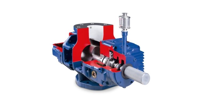 Por exemplo, a série HV é equipada com um anel de vedação de eixo de pistão especial entre a câmara de transporte e as câmaras de rolamento. Além do mais, está instalada uma câmara neutra de grande dimensão com canais condensados. Ainda mais, a câmara neutra pode ser purgada com gás de vedação, de modo a conseguir um maior efeito de vedação. A vedação do veio de acionamento é garantida através de anéis de vedação radiais (FKM) com uma câmara de óleo.