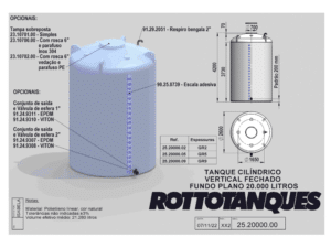 O Tanque Vertical fechado cilíndrico com o fundo plano de Polietileno de 20.000 litros é a solução mais prática, econômica e segura de armazenar materiais líquidos. É um reservatório fechado, com tampo abaulado, boca de inspeção e tampa sobreposta de 700 mm, alças de içamento e capelas para a instalação de acessórios. Os tanques desta linha podem ser produzidos em 3 graus de resistência diferentes, o GR é definido conforme o produto que será armazenado.