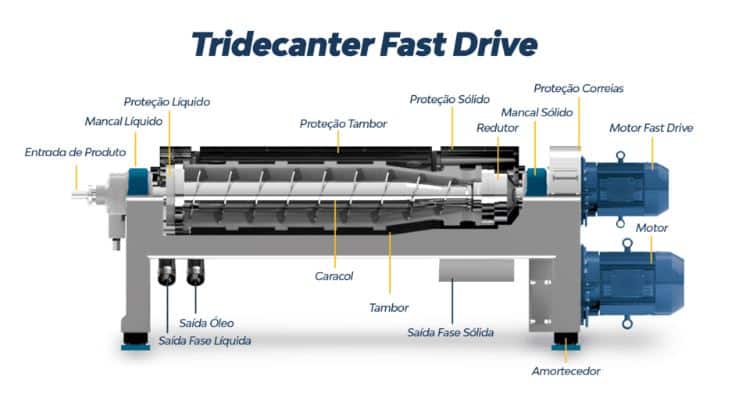O tridecanter centrífugo é um equipamento utilizado para separação de sólidos em suspensão e duas fases líquidas. A característica que distingue um tridecanter centrífugo de outros tipos de centrífugas, como as centrífugas verticais, por exemplo, é o fato de possuir um rotor cilíndrico cônico horizontal equipado com um caracol para descarga contínua de sedimentos sólidos.